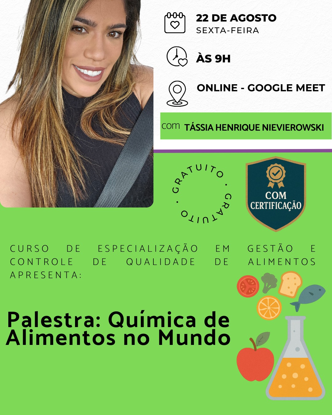 A palestrante será Tássia Henrique Nievierowski, graduada em Química de Alimentos (UFPel) com intercambio na UCDavis (California, EUA), mestrado em Ciência de Alimentos (UEM), doutora em Ciência e Tecnologia de Alimentos (UFRGS) com parte da pesquisa realizada na Itália.