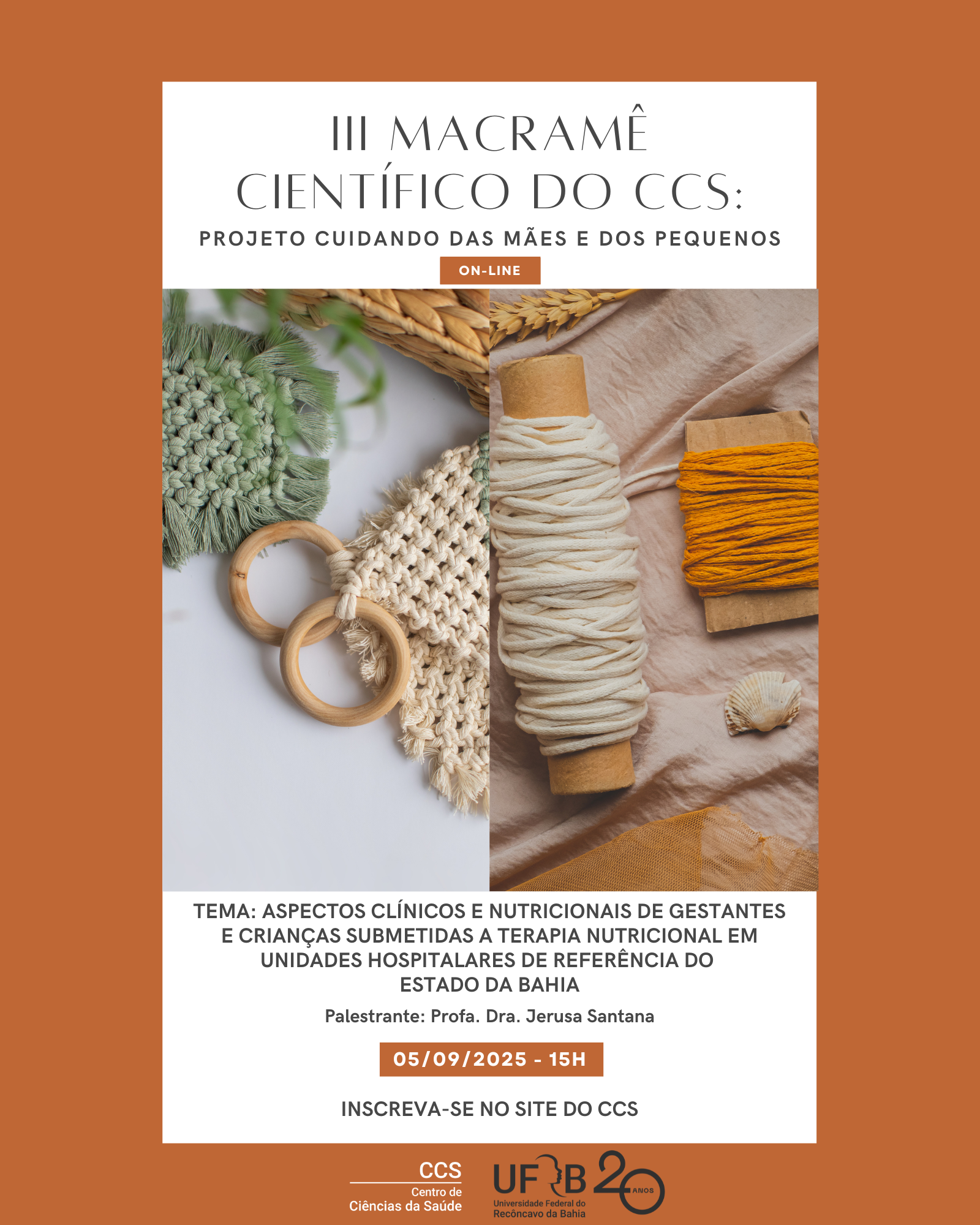 No dia 05/09, às 15 horas, acontece via Google Meet, o III Macramê Científico no Centro de Ciências da Saúde: Projeto Cuidando das Mães e dos Pequenos. O tema abordado será "Aspectos clínicos e nutricionais de gestantes e crianças submetidas a Terapia Nutricional em Unidades hospitalares de referência do estado da Bahia" ministrado pela Profa. Dra. Jerusa Santana, docente do Centro de Ciências da Saúde - CCS/UFRB.