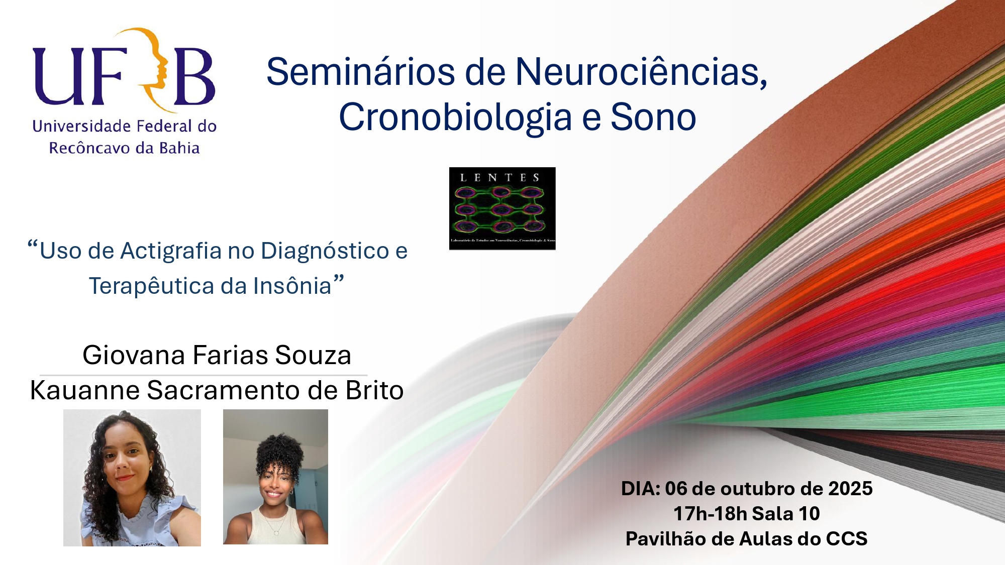 Convidamos a Comunidade Acadêmica do Centro de Ciências da Saúde a prestigiar o Seminário de Neurociências, Cronobiologia e Sono a ser realizado no dia 06 de outubro de 2025, das 17h às 18h, na sala 10 do Pavilhão de Aulas. O tema deste seminário, “Uso da Actigrafia para Diagnóstico e Terapêutica da Insônia”, será conduzido pelas discentes Giovana Farias Souza e Kauanne Sacramento de Brito.