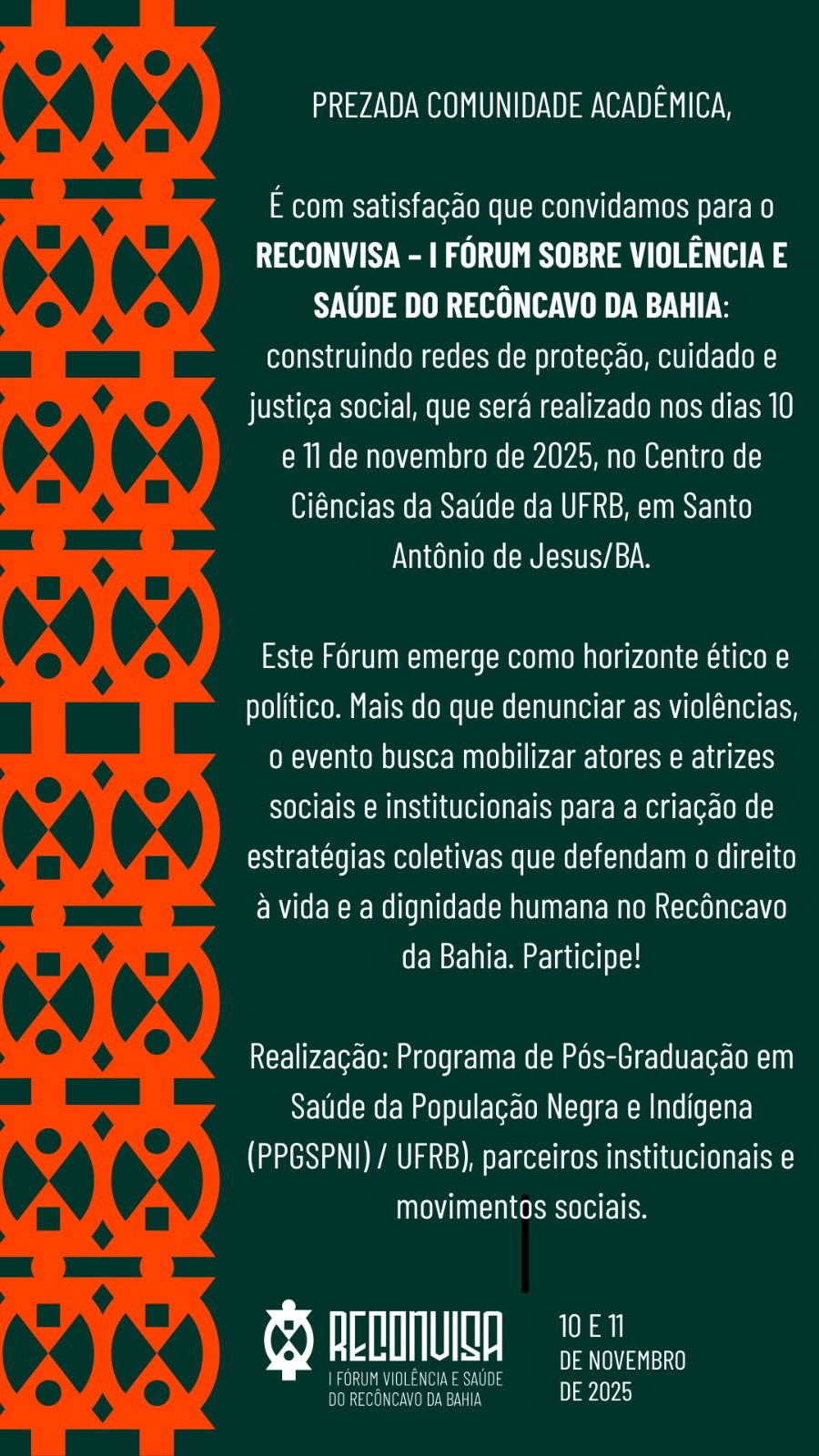 É com satisfação que convidamos para o RECONVISA - I FÓRUM SOBRE VIOLÊNCIA E SAÚDE DO RECÔNCAVO DA BAHIA: