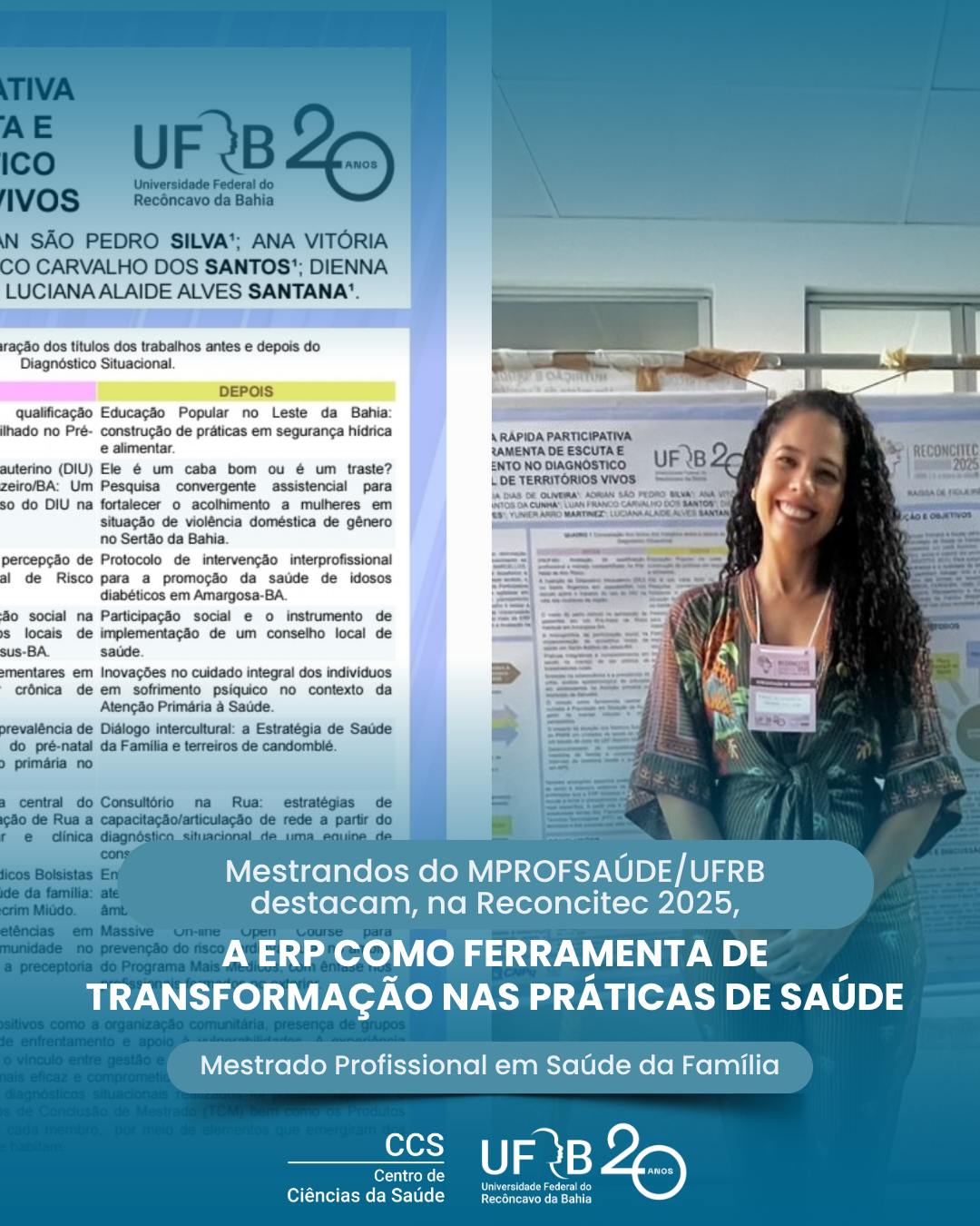 Para a 11ª edição da Reconcitec (Reunião Anual de Ciência, Tecnologia, Inovação e Cultura) da Universidade Federal do Recôncavo da Bahia (UFRB), realizada entre 21 e 24 de outubro de 2025, Raissa de Figueiredo Carvalho, apresentou o trabalho "A estimativa rápida participativa como ferramenta de escuta e planejamento no diagnóstico situacional de territórios vivos", fruto de um trabalho coletivo de todos/todas mestrandos/mestrandas da T5 do MPROFSAUDE UFRB, sob orientação da Prof. Dra. Luciana Alaide Alves Santana. Onde consideraram "a ERP mais do que um instrumento técnico, é um dispositivo político-pedagógico de transformação das práticas de saúde, capaz de produzir intervenções mais justas, sensíveis e resolutivas".