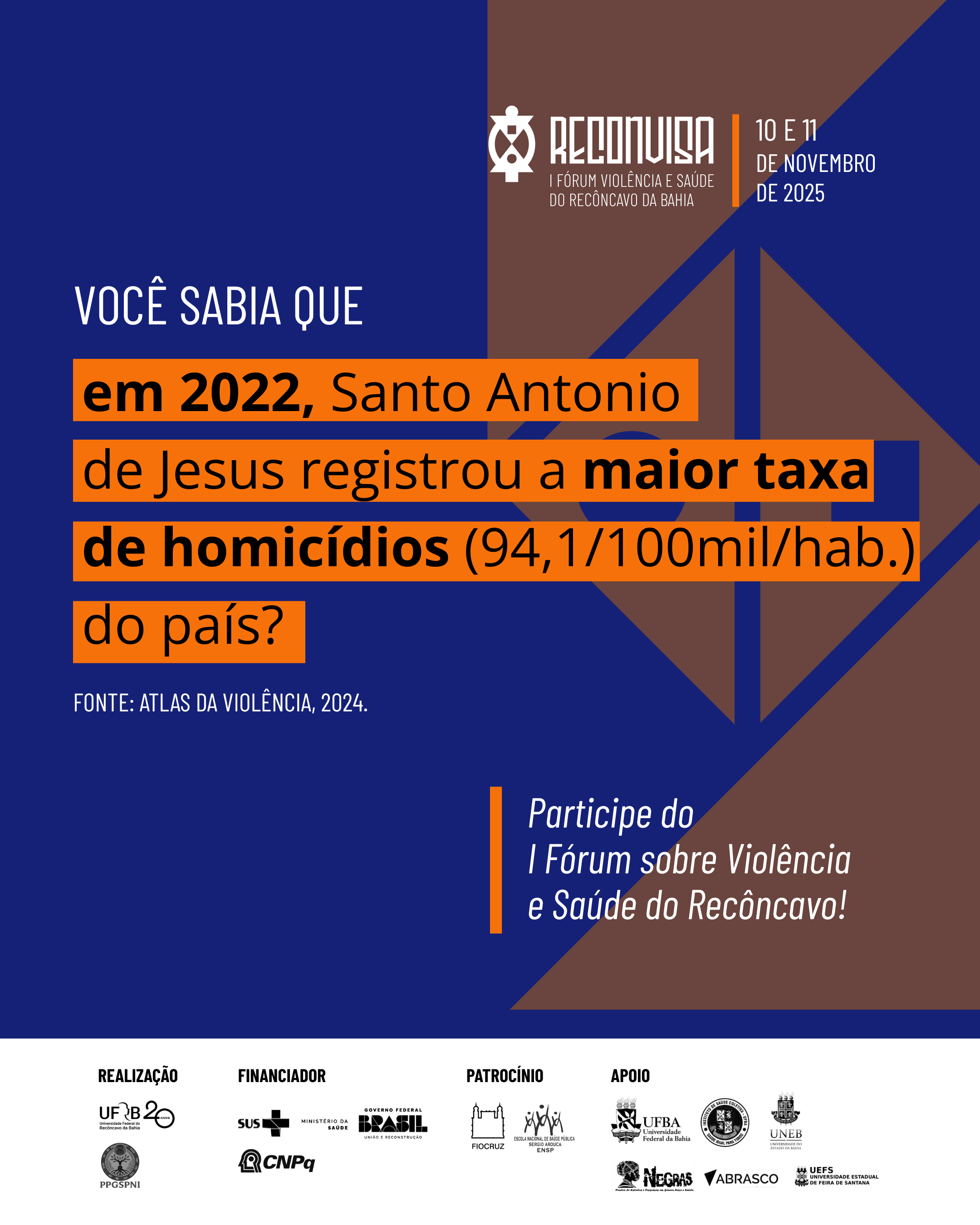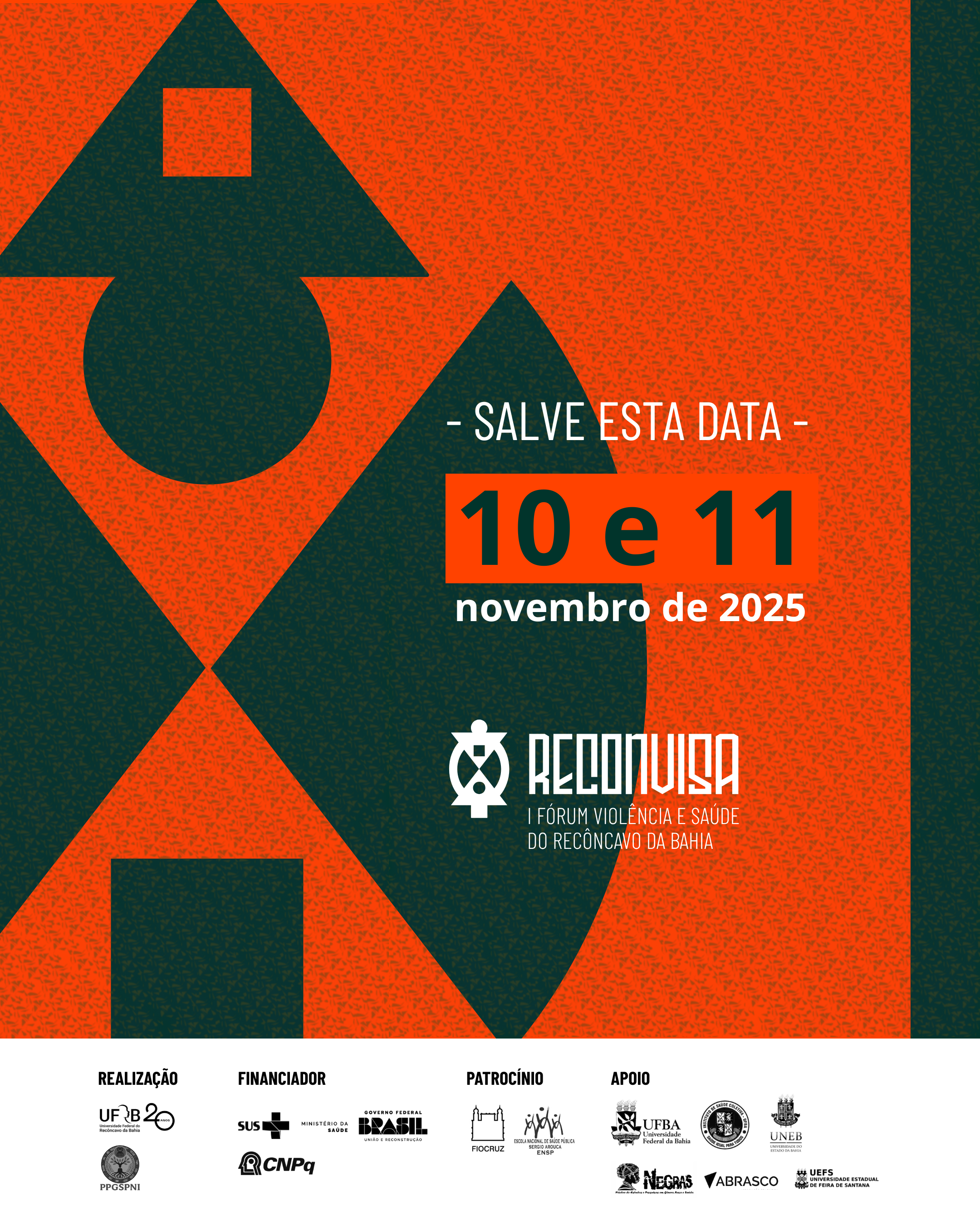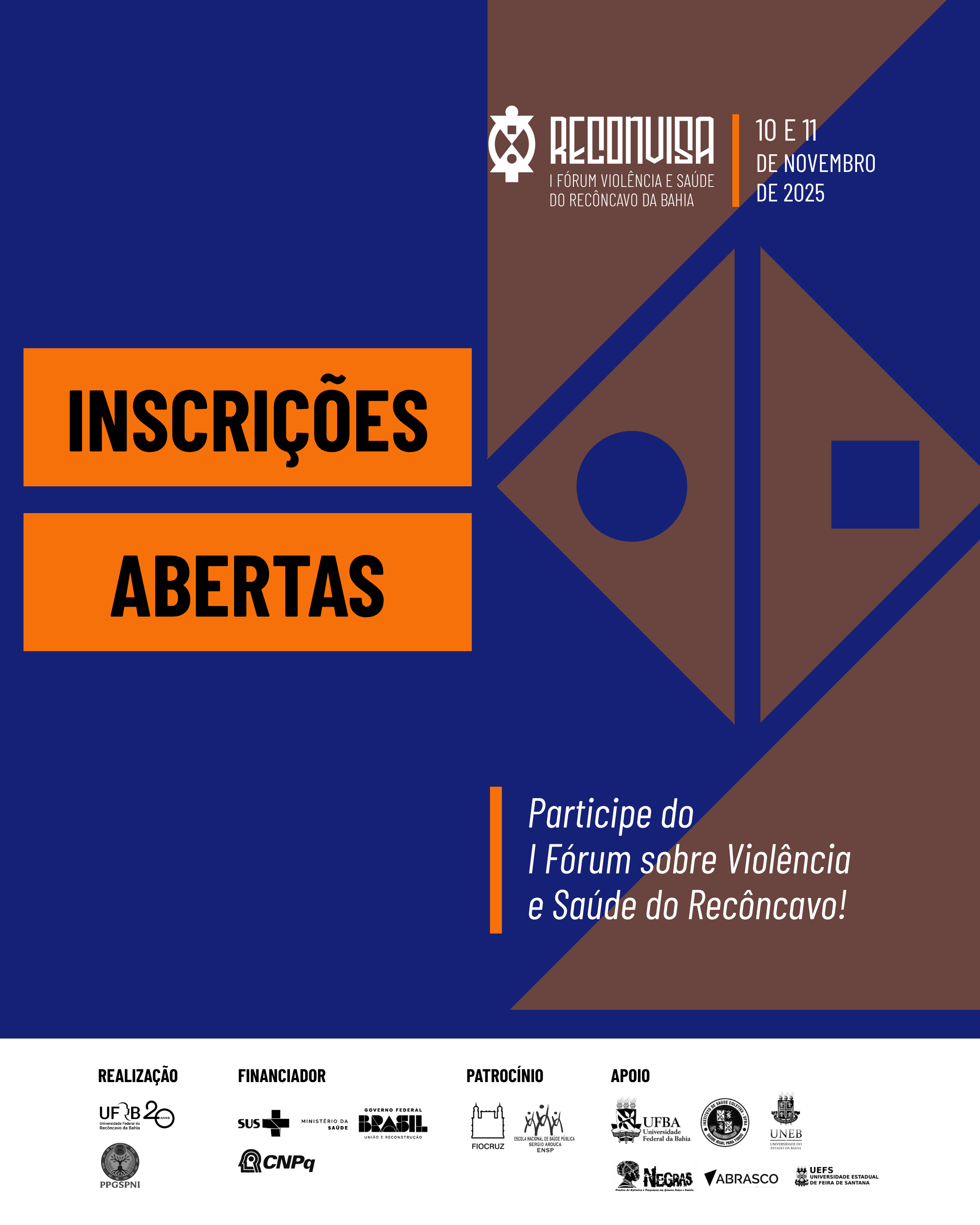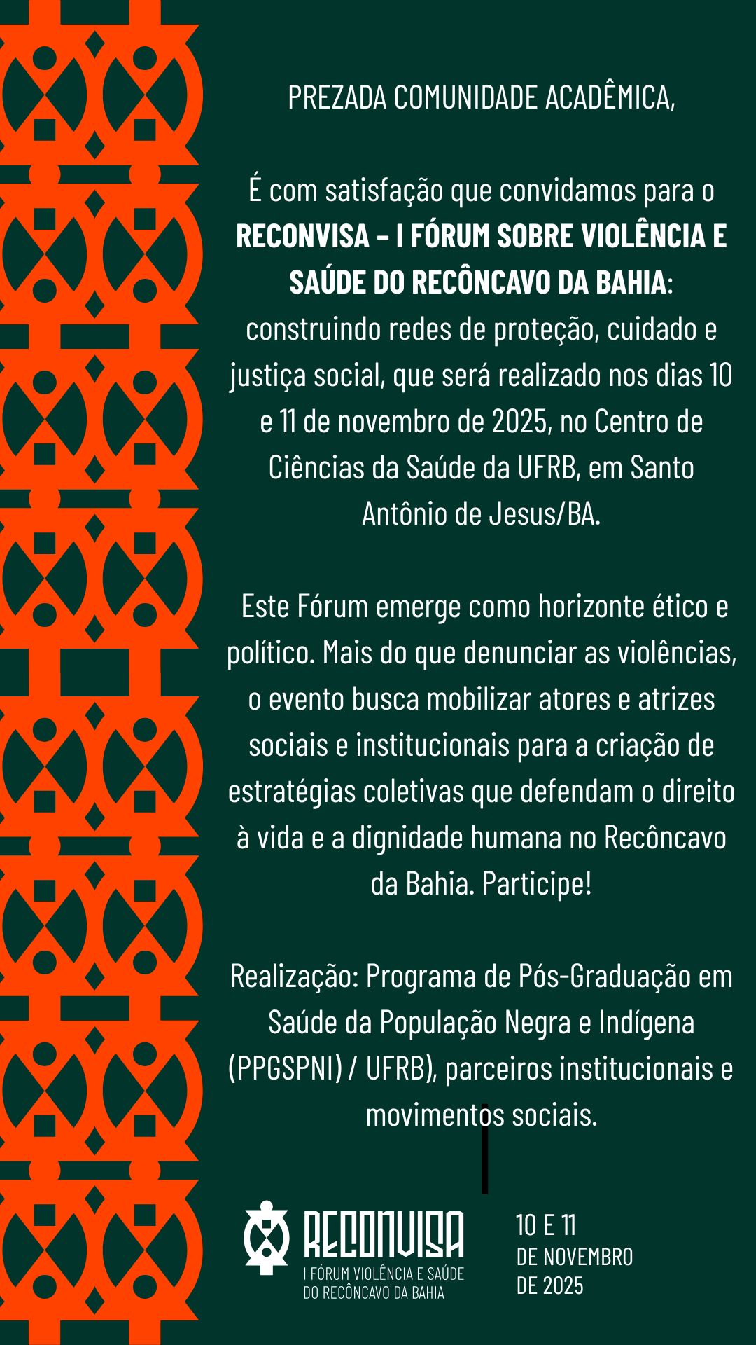 Estão abertas as inscrições para o RECONVISA - I Fórum sobre Violência e Saúde do Recôncavo da Bahia: construindo redes de proteção, cuidado e justiça social. O Fórum é uma iniciativa do Programa de Pós-Graduação em Saúde da População Negra e Indígena (PPGSPNI/UFRB), em parceria com outras instituições e movimentos sociais e tem por objetivo mobilizar atores e atrizes sociais e institucionais que defendem o direito à vida e a dignidade humana e, assim, promover discussões interinstitucionais e interdisciplinares sobre os impactos da violência na saúde e na vida social, articulando estratégias de enfrentamento no município de Santo Antônio de Jesus e no território do Recôncavo da Bahia.