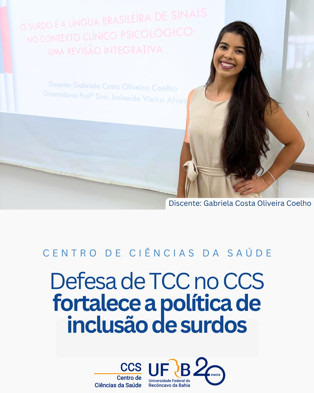 "O Surdo e a Língua Brasileira de Sinais no contexto psicológico: uma revisão integrativa". Com esse tema a estudante de psicologia Gabriela Costa Oliveira Coelho defendeu o trabalho de conclusão do curso - TCC, dia 01 de dezembro, no Centro de Ciências da Saúde.