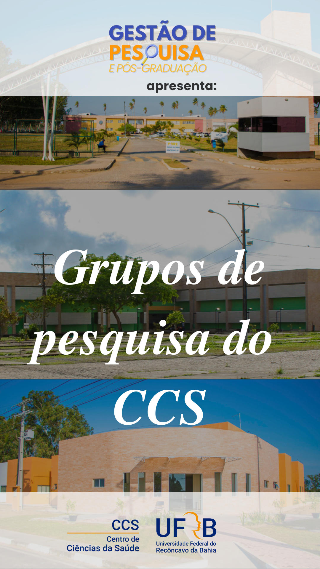 O Centro de Ciências da Saúde – CCS/UFRB, através da Gestão de Pesquisa e Pós-Graduação, representada pela Professora Paloma Pinho, lançou, dia 06 de junho, uma série de vídeos curtos que apresentarão forma objetiva e dinâmica os Grupos de Pesquisa do CCS.