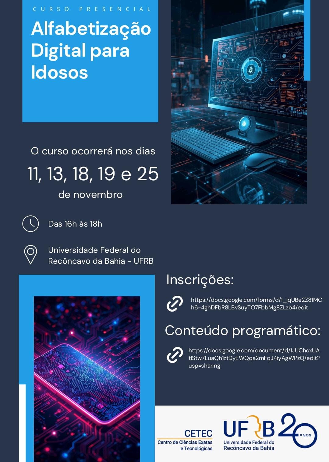 O Centro de Ciências Exatas e Tecnológicas (CETEC) da Universidade Federal do Recôncavo da Bahia (UFRB) promoverá, no mês de novembro, o curso Alfabetização Digital para Idosos, em formato presencial. A iniciativa tem como objetivo promover a inclusão digital da população idosa, proporcionando o acesso a ferramentas tecnológicas e o desenvolvimento de habilidades básicas no uso de computadores e dispositivos móveis.