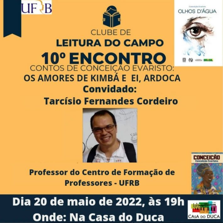 O Clube de Leitura do Campo realiza no dia 20 de maio, Às 19h, na CaSA do DUCA, o seu 10º encontro, com o tema "Contos de Conseição Evasristo: Os Amores de Kimbá e Ei, Ardoca". O evento tem como convidado Tarcísio Fernandes Cordeiro, professor do Centro de Formação de Professores da UFRB.