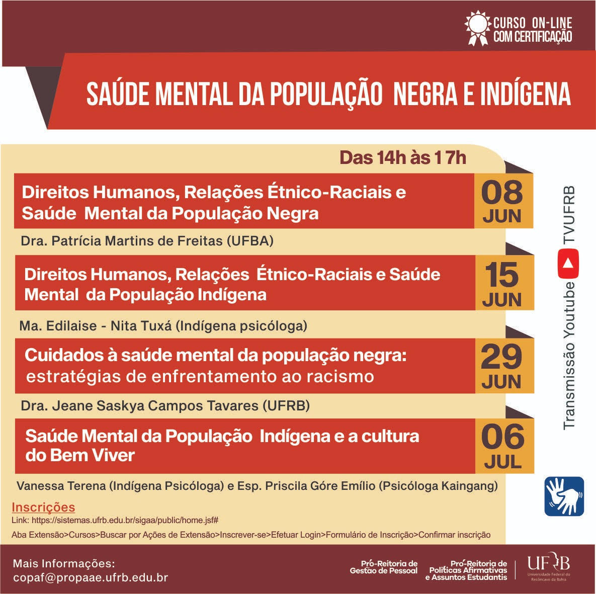 De 08/06 a 06/07/2022, a Universidade Federal do Recôncavo da Bahia (UFRB), por meio da Pró-reitoria de Políticas Afirmativas e Assuntos Estudantis (PROPAAE) em parceria com a Pró-Reitoria de Gestão de Pessoas (PROGEP), promoverá o curso Saúde Mental da População Negra e Indígena.