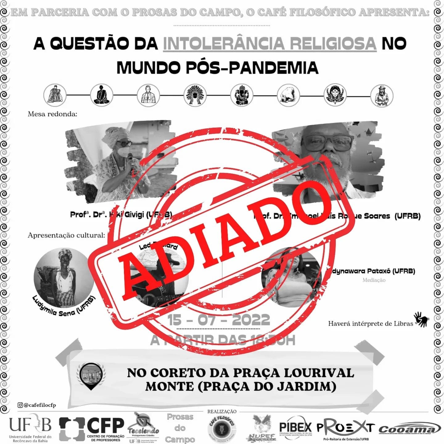 O evento será realizado no dia 15 de julho, a partir das 18h30, no coreto da Praça Lourival Monte (Praça do Jardim) e terá como tema "A questão da intolerância religiosa no mundo pós-pandemia" e a mesa redonda contará com a participação da Profa. Dra Ana Cristina Nascimento Givigi (UFRB) e o Prof. Dr. Emanuel Luís Roque Soares (UFRB), com mediação de Indynawara Pataxó (UFRB).