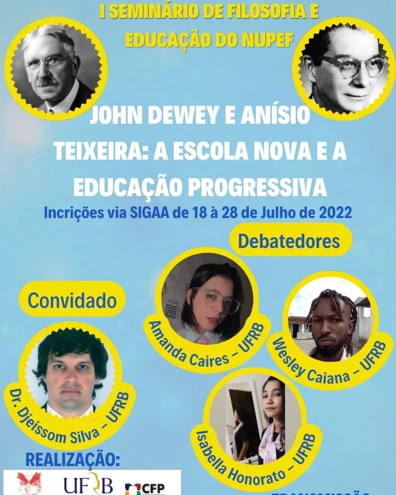 O I Seminário de Filosofia e Educação do NUPEF pretende discutir o tema "John Dewey e Anísio Teixeira: a nova escola e a educação progressiva" com uma palestra do Professor Dr. Djeissom da Silva Ribeiro (docente do CFP/UFRB, seguida de um debae com os estudantes do componente Filosofia e Educação, GCFP 1166. O evento realizado pelo NUPEF faz parte das atividades de extensão vinculadas a esse componente.