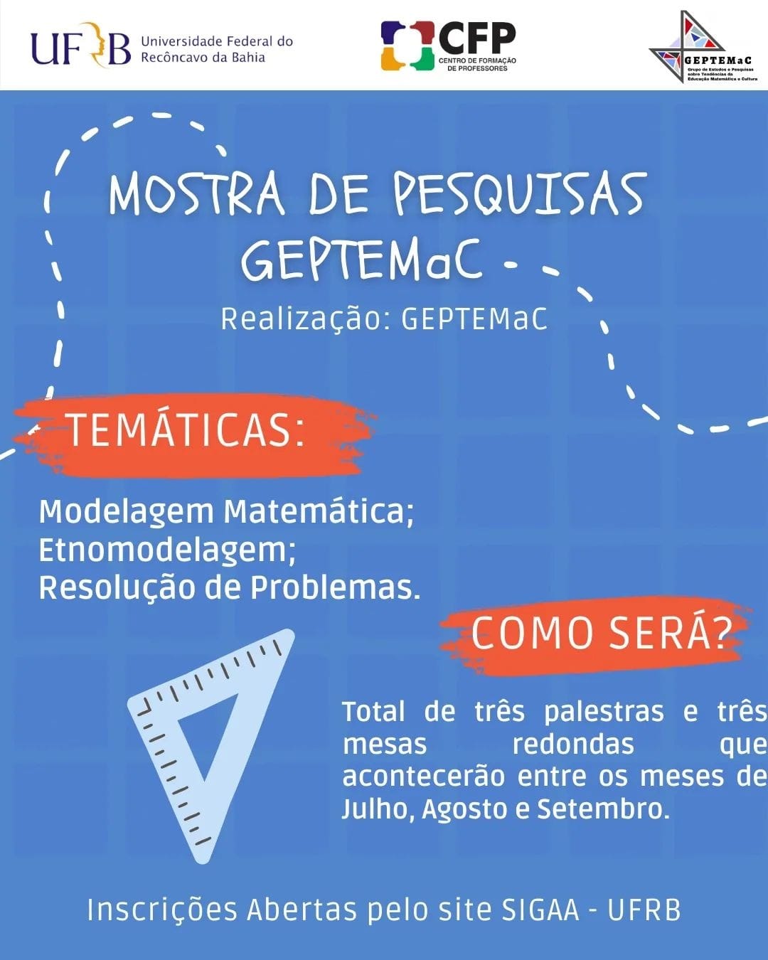 Este evento tem como objetivo divulgar algumas das pesquisas realizadas no âmbito do Grupo de Estudos e Pesquisas sobre Tendências da Educação Matemática e Cultura (GEPTEMaC). As pesquisas serão apresentadas em mesas redondas com temáticas diferenciadas, incluindo apresentações de dissertações, trabalhos de conclusão de curso, pesquisas publicadas em periódicos e projetos em desenvolvimento pelos integrantes do grupo. A temáticas abordadas serão principalmente Modelagem Matemática, Etnomodelagem e Resolução de Problemas. Pretende-se que sejam transmitidas ao vivo seis mesas. As três primeiras serão pesquisas já defendidas por membros do grupo; e as três últimas serão artigos e projetos em desenvolvimento. Esperamos que as pesquisas possam contribuir no processo formativo inicial dos estudantes de licenciatura em Matemática da UFRB, assim como graduandos de outros cursos e instituições que se interessam pelas temáticas. Além disso, temos a intenção de contribuir com a formação continuada de professores da Educação Básica, pois as pesquisas tem como foco o ensino e aprendizagem de Matemática na Educação Básica.