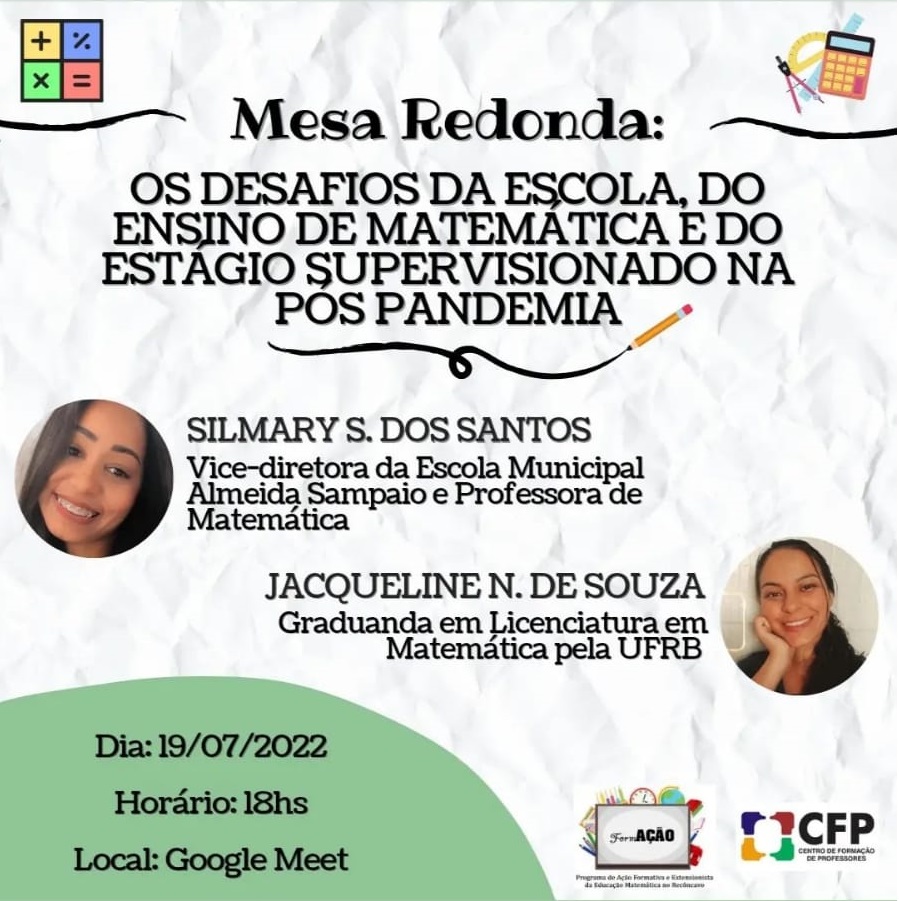 A presente mesa-redonda constitui-se como uma ação de extensão que tem o objetivo de tematizar os desafios enfrentados na pós-pandemia pela escola, pelos professores de matemática quando perspectivam o ensinoo, bem como pelos estágios supervisionados obrigatórios, Trata-se de uma mesa que possui como convidadas uma professora de matemática da rede municipal de ensino, em Amargosa-Ba, a qual também atual como vice-diretora da Escola Municipal Almeida Sampaio, bem como uma estagiária que está desenvolvendo seu estágio de regência na Escola Estadual Santa Bernadete, também sediada em Amargosa-Ba. São olhares de sujeitos diferentes que estão na sala de aula e estão lidando com desafios emergentes na escola básica.