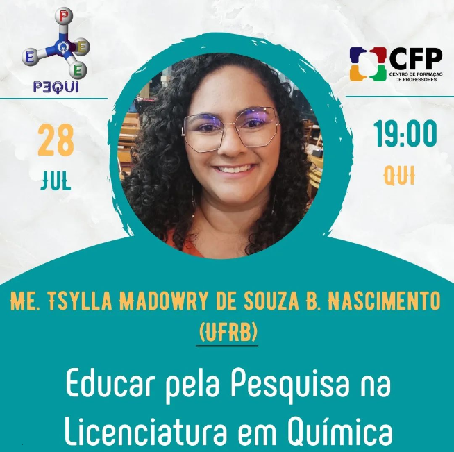 No dia 28/07/2022, teremos o nosso quinto e último encontro do Grupo de Estudos do PƎQUI do Semestre Letivo 2021.2.Tema do encontro:Educar pela Pesquisa na Licenciatura em Química.Com a Profa. Me. Tsylla Madowry de Souza Bouças Nascimento, professora do curso de Licenciatura em Química do CFP/UFRB e também docente da rede básica de ensino da Secretaria de Educação do Estado da Bahia (SEC-BA).Mediação da Profa. Dra. Fabiana Rodrigues dos Santos (UFRB)Haverá lista de presença.Para obter a certificação do grupo de estudos os seus integrantes devem ter mais de 75% de frequência.Este é um evento interno do PƎQUI.