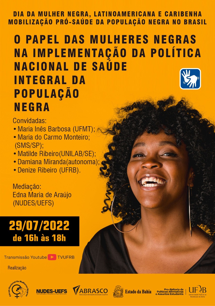Em alusão ao Dia da Mulher Negra, Latinoamericana e Caribenha e à Mobilização Pró-Saúde da População Negra no Brasil, a UFRB e instituições parceiras e organizações da sociedade civil promoverão a Roda de Conversa intitulada “O Papel das Mulheres Negras na Implementação da Política Nacional de Saúde Integral da População Negra”.