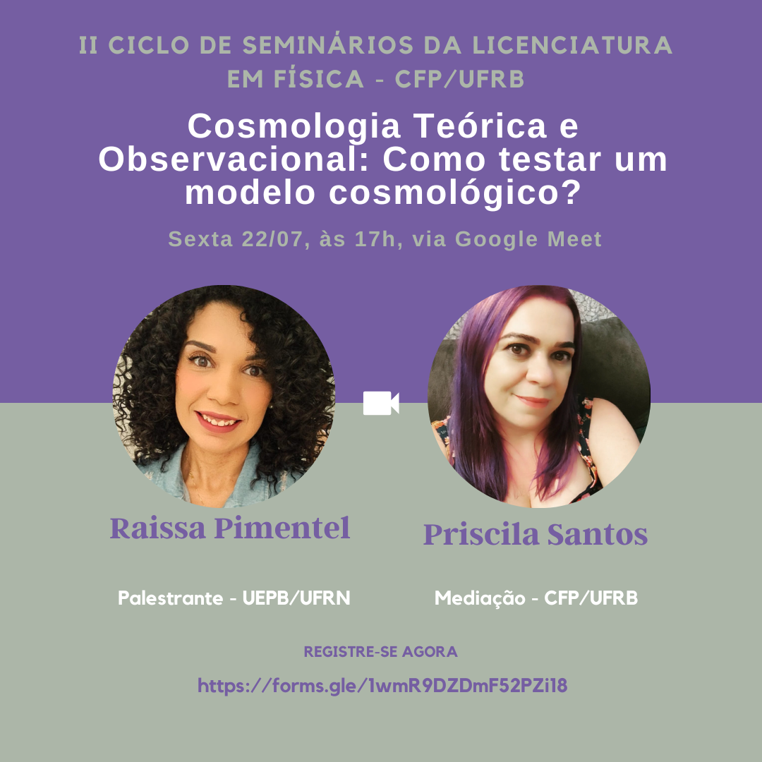 #ParaTodosVerem Arte digital com fundo em tons de lilás e cinza. Na parte superior, o texto "II Ciclo de Seminários da Licenciatura em Física - CFP/UFRB, Cosmologia Teórica e Observacional: Como testar um modelo cosmológico?, sexta, 22/07, às 17h, via Google Meet". Na parte central, do lado esquerdo, foto da professora Raissa Pimentel, com a legenda "palestrante - UEPB/UFRN". Do lado direito, na parte central, foto da professora Priscila Santos, com a legenda "mediação - CFP/UFRB". No rodapé, a chamada "Registre-se agora https://forms.gle/1wmR9DZDmF52PZi18".