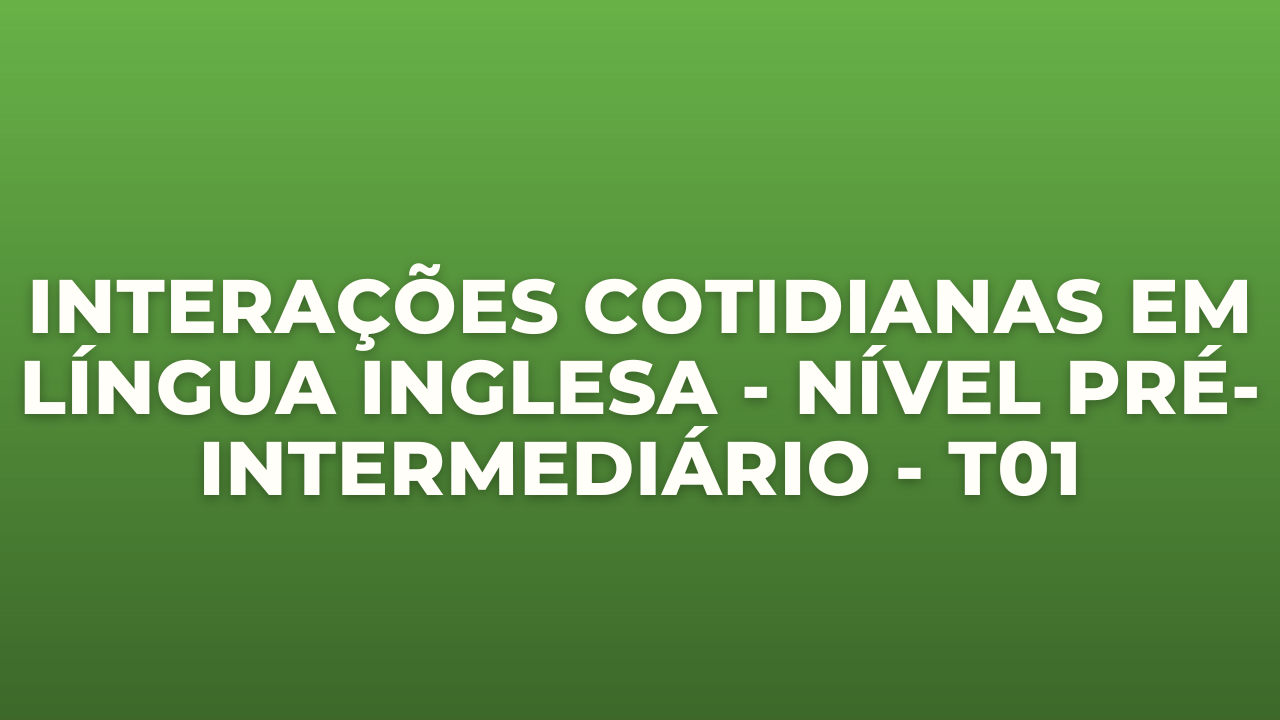 Curso de língua inglesa em nível pré-intermediário focando em interações em contexto informal sobre temas cotidianos. Reconhecimento e prática de funções discursivas da língua inglesa e gêneros que circulam no dia a dia do indivíduo e das comunidades em que ele está inserido. Reconhecimento das características dessas funções e gêneros. Reconhecimento dos elementos de discurso, gramática e vocabulário dessas funções e gêneros.