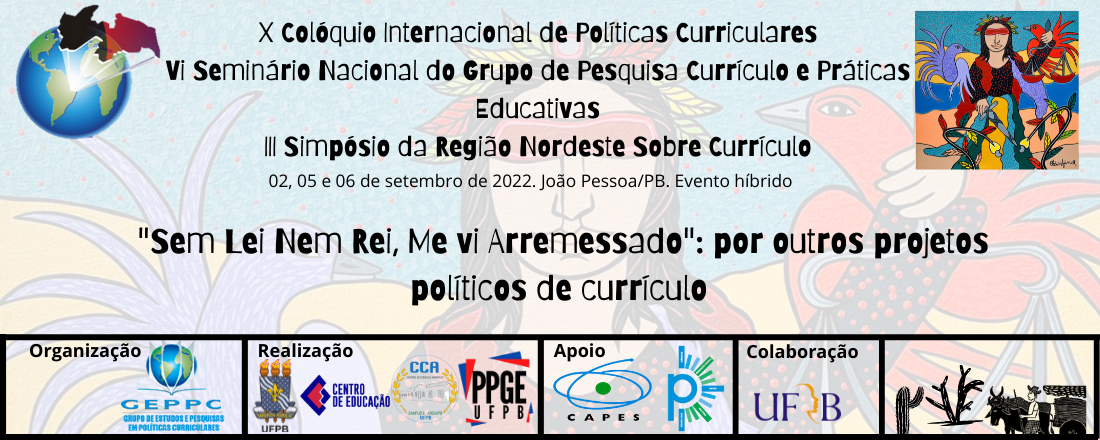 2022… Celebramos 20 anos de existência com o “X Colóquio Internacional de Políticas Curriculares”. A décima edição está prevista para acontecer entre os dias 02, 05 e 06 de setembro de 2022, tendo como tema: “'SEM LEI NEM REI, ME VI ARREMESSADO'- por outros projetos políticos de currículo”. Mobilizados/as pelo soneto “A infância”, de Ariano Suassuna, e pela obra “Deusa da Justiça” do artista plástico Clóvis Junior, ambos paraibanos, problematizaremos o cenário político (inter)nacional e suas implicações para as políticas curriculares nacionais, que dar significado a algumas formas de ser/estar/sentir “lançados”, sobre o que ainda não conhecemos.