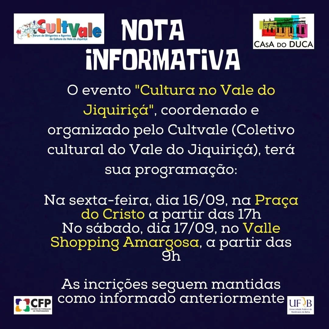 Nos dias 16 e 17 de setembro, temos um encontro marcado com os coletivos culturais do Vale do Jiquiriçá e com Maria Marighella.Maria Marighella é atriz, professora, gestora e ativista cultural, atuou por mais de dez anos na gestão de políticas públicas de cultura, nos governos baiano e federal, e contribuiu com diversas instituições do país.Traz em seu nome a luta por democracia no Brasil, que tem em Carlos Marighella como um dos seus símbolos.