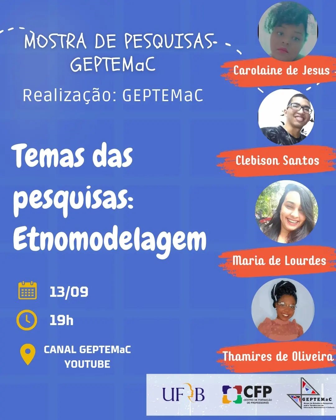 Trabalhos de Conclusão de Curso em desenvolvimento no curso de Licenciatura em Matemática Centro de Formação de Professores Universidade Federal do Recôncavo da Bahia (UFRB) "ETNOMODELAGEM E A CULTURA FUMAGEIRA NA CIDADE DE CABACEIRAS DO PARAGUAÇU - BA: POSSIBILIDADES PARA ABORDAR A LEI 11.645/2008 NO ENSINO DE MATEMÁTICA" Autor: Clebison Pereira dos Santos Orientadora: Zulma Elizabete de Freitas Madruga "ETNOMODELAGEM E PRODUÇÃO DE FARINHA: POSSIBILIDADES DE UMA AÇÃO PEDAGÓGICA PARA O ENSINO DE MATEMÁTICA" Autora: Maria de Lourdes Pereira Lima Neta Orientadora: Zulma Elizabete de Freitas Madruga "ETNOMODELAGEM: UM ESTUDO SOBRE O JOGO YOTÉ COMO RECURSO PEDAGÓGICO NO ENSINO DA MATEMÁTICA" Autora: Thamires Peixoto de Oliveira Orientadora: Zulma Elizabete de Freitas Madruga "ETNOMODELAGEM E A PRODUÇÃO ARTESANAL DE CESTOS: UMA ANÁLISE SOB A ÓPTICA DA TEORIA DAS TRANÇAS" Autora: Carolaine Félix de Jesus Orientadora: Zulma Elizabete de Freitas Madruga Co-orientador: Renato dos Santos Diniz