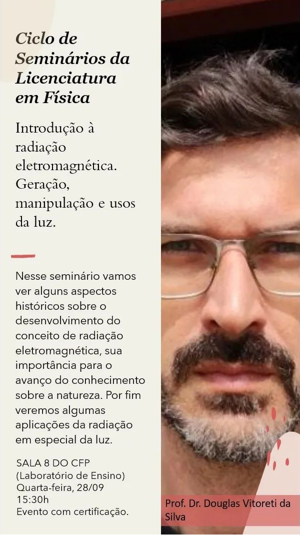 Ciclo de Seminários da Licenciatura em Física de volta!⚠️ Evento com certificação⚠️ Modo presencialIntrodução à radiação eletromagnética. Geração, manipulação e usos da luz.Nesse seminário vamos ver alguns aspectos históricos sobre o desenvolvimento do conceito de radiação eletromagnética, sua importância para o avanço do conhecimento sobre a natureza. Por fim veremos algumas aplicações da radiação em especial da luz.SALA 8 DO CFP (Laboratório de Ensino), Quarta-feira, 28/0915:30h