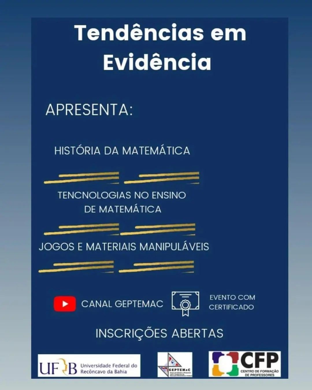 Este evento refere-se ao atendimento à curricularização da extensão, e corresponde a parte das ações extensionistas da disciplina GCFP965 Metodologia do Ensino da Matemática. O público-alvo são estudantes da Licenciatura em Matemática, professores da Educação Básica; estudantes de pós-graduação e demais interessados no ensino da Matemática. Consiste numa série de três palestras, durantes os meses de outubro, novembro e dezembro de 2022, ministradas virtualmente por meio do canal GEPTEMaC no YouTube, onde os convidados, todos professores universitários, tratarão, cada um, sobre uma Tendência da Educação Matemática, sendo elas: Historia da Matemática; Jogos e materiais manipuláveis; e Tecnologias no Ensino da Matemática.