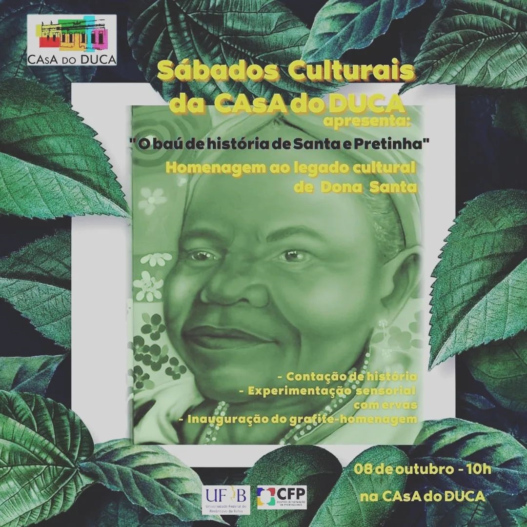 Sábado, as 10h da manhã é dia de celebração na CAsA do DUCA!Convidamos a todos para uma singela homenagem que vamos prestar à Dona Santa, essa referência viva, portadora de saberes ancestrais e figura tão importante para nossa Universidade desde a sua inauguração!Nossa intenção com essa atividade é promover a aproximação entre os mais novos e os mais velhos, uma vez que a conexão entre o passado e o futuro é fundamental para colaborarmos para a continuidade disso que chamamos de mundo!Para tanto, estamos organizando uma manhã de contação de história, experimentação sensorial com ervas, inauguração do Grafitti homenagem e outras coisas gostosas que estaremos compartilhando com Dona Santa, sua irmã Dona Preta, seus familiares, muitas crianças e adultos!Venham, tragam os pequenos!É sábado, dia 8/10, as 10h na CAsA do DUCA!