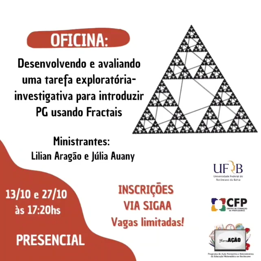 Esta oficina é uma ação do "FormAção: Programa de ação formativa e extensionista da Educação Matemática no Recôncavo" que fora perspectivada para a educação básica, considerando que o ensino de matemática no Ensino médio tem sido priorizado por meio de memorização a fórmulas e exercícios. Ao contrário disso, planejmanos essa oficina para vialibilizar um ensino mais exploratório e investigativo do conteúdo de Progressões Geométricas utilizando os fractais (refere-se a estruturas que apresentam padrões que podem ser analisados matematicamente). Antes de realizar essa oficina na escola básica, perscpetivamos aplicar com estudantes da graduação e professores da escola básica a fim de aprensentar e avaliar a proposta, bem como gerar reflexões téricas e práticas. Nessa linha, espera-se que essa oficina apresente uma maneira de ensinar, mas também inspire os participantes a desenvolverem tarefas dessa natureza em suas aulas de matemática.