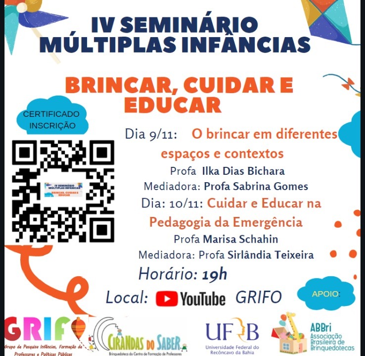 O IV Seminário Múltiplas Infâncias é promovido anualmente pelo GRIFO - Grupo de pesquisa em Infâncias Formação de professores e Políticas Públicas (CFP-UFRB). Este ano terá como tema "Brincar, Cuidar e Educar". O objetivo do seminário é discutir as contribuições do brincar, do cuidar e do educar nos processos de formação das crianças como sujeito integral. O IV Seminário Múltiplas Infâncias acontecerá na modalidade remota nos dias 9/11 e 10/11, às 19h e será transmitido pelo canal do GRIFO https://www.youtube.com/c/GrifoUfrb.