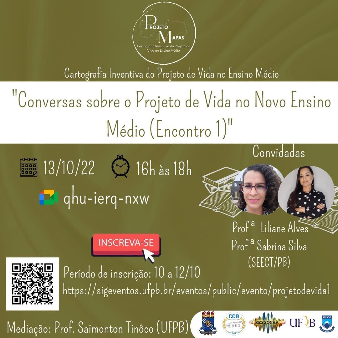 Integrantes do “Projeto Mapas: cartografia inventiva do Projeto de Vida no Ensino Média”, @projetomapas e pesquisadores/as do @coletivoressonar convidam a comunidade em geral para conversarmos sobre o Projeto de Vida do Novo (velho) Ensino Médio. Esse projeto de extensão é mais uma parceria entre o @ccaufpboficial e o @cfp.ufrb. A conversa acontecerá no dia 13/10/22, no horário das 16 horas às 18 horas", no link do Meet "qhu-ierq-nxw", teremos como conversantes a Profª Liliane Alves e a Profª Sabrina Silva da SEECT/PB. A mediação ficará por conta do professor Saimonton Tinôco (UFPB). Quem tiver interesse em conversar conosco, basta inscrever-se no evento do sigevento da UFPB, no seguinte link: