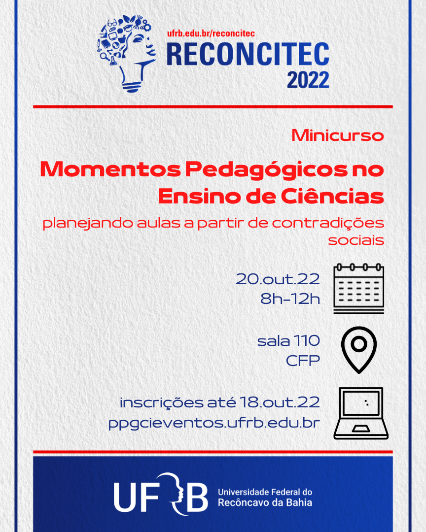 Proposto pelo DiCE (Grupo de pesquisa Diálogo, crítica e educação em ciências), o minicurso visa aprofundar a discussão sobre dos Momentos Pedagógicos através de atividades teóricas e práticas. A partir de problemas relacionados às contradições sociais vivenciadas pela comunidade escolar, elaboraremos aulas para as disciplinas da área de Ciências da Natureza. O minicurso é indicado para professoras(es) da Educação Básica e licenciandas(os) em Biologia, Física, Química e Pedagogia.