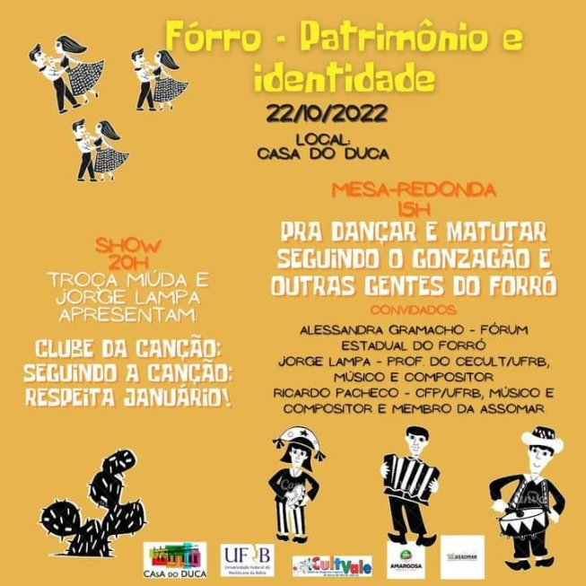 Dia 22 vai a CAsA do DUCA vai estar animada!A tarde a prosa vai ser boa com Alessandra Gramacho (Fórum Estadual do Forrró), Ricardo Pacheco (professor do CPF/UFRB, músico e compositor) e Jorge Lampa (prof. do CECULT/UFRB, músico e compositor).O assunto é a salvaguarda do forró como patrimônio imaterial, tema de extrema importância que retratará a relevância desse ritmo genuinamente brasileiro.Essa prosa boa vai acontecer às 15h no Auditório da CAsA do DUCA.Depois, as 20h, é hora de arrastar as chinelas no quintal da CAsA do DUCA com a banda Troça miúda e Jorge Lampa. Nessa apresentação os convidados pretendem seguir a canção e respeitar Januário! Vai ter mto forró pra animar a rapaziada!Então, bora prosear e dançar, que esse sábado promete!