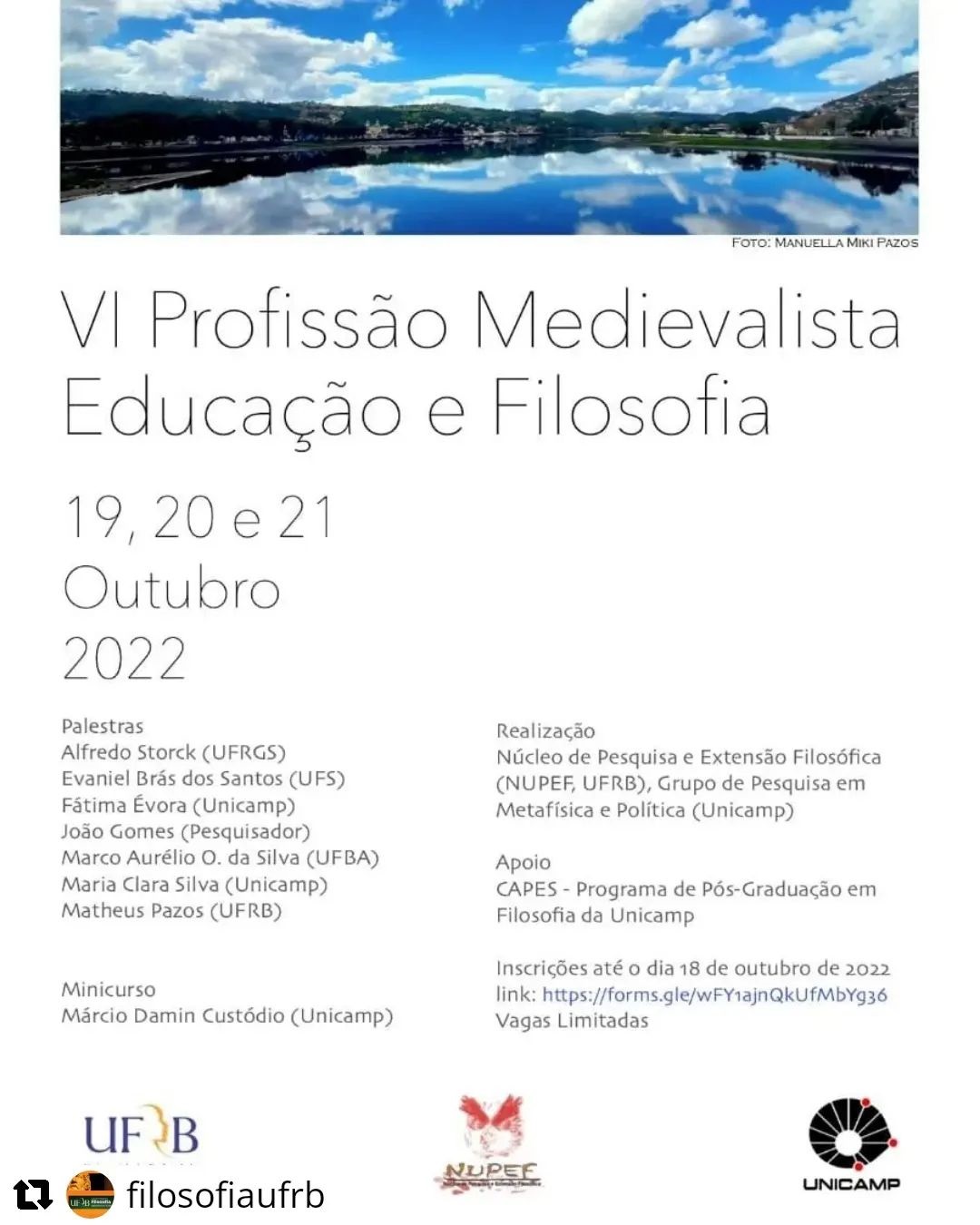 VI Profissão Medievalista: Educação e Filosofia.Evento de filosofia medieval que será sediado, neste ano, na UFRB.Nesta edição, o tema geral será Educação e Filosofia na Idade Média.O evento é coordenado pelo prof. Matheus Pazos (UFRB/NUPEF) e pelo prof. Márcio Damin (Unicamp).Para inscrições, acessar: https://docs.google.com/forms/d/e/1FAIpQLSeetNfYYAB1YPIbJu-p_O_Ru0IsIHBvLl6DbFmrzT2s0P2YRw/viewform
