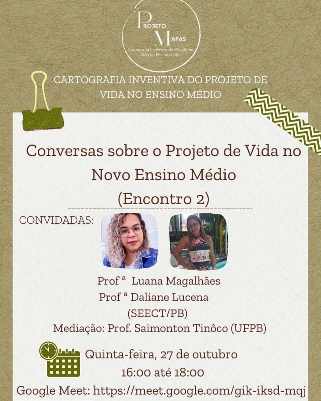 Convidamos todo mundo para mais uma outra conversa sobre projeto de vida do Novo Ensino Médio! Teremos como debatedoras, as professoras @magalhae5lu e @dalianelucena, com mediação do professor @saimontontsA atividade será remota, nesta quinta 27 de outubro de 2022, às 18H.Participem!Inscrevam-se!Coletivo de Pesquisa @coletivoressonarProjeto de ensino @projetomapas#ParaTodesVerem #ParaTodasVerem #ParaTodosVerem: [Descrição da imagem] Card com o fundo verde amadeirado, tendo na parte superior a logomarca do projeto, que é o mapa da Paraíba vazado, dentro de um círculo, onde está escrito: "Projeto Mapas: Cartografia Inventiva do Projeto de vida no Ensino Médio". Em seguida, temos uma caixa de texto branca, onde contêm as informações do encontro, escritas em letras na cor marrom: "Conversas sobre o Projeto de Vida no Novo Ensino Médio (Encontro 2); as fotos das convidadas e seus respectivos nomes: “Profª Luana Magalhães” e "Profª Daliane Lucena” da "SEECT/PB.”; a "Mediação: Prof. Saimonton Tinôco (UFPB)"; a data: "quinta-feira, 27 de outubro"; o horário: "das 16 horas às 18 horas"; e o link do Google Meet: "https://meet.google.com/gik-iksd-mqj." Na sequência, do lado esquerdo, temos o QR Code para realizar a inscrição e ao lado deste, escrito em letras minúsculas, temos o "Período de inscrição: 24 a 26/10" e o link para realizar a inscrição no evento:”https://sigeventos.ufpb.br/eventos/public/evento/projetodevida2". Por fim, na parte inferior, fora da caixa de texto, temos as logomarcas das instituições promotoras responsáveis pela realização do encontro: UFPB, CCA, Ressonar, UFRB e UFCG [Fim da Descrição].