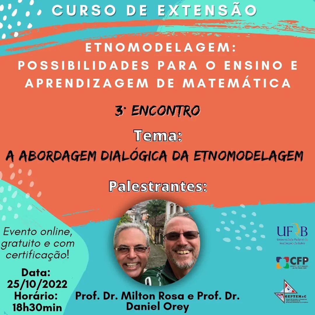 Amanhã teremos mais um encontro do curso de Etnomodelagem. Estaremos discutindo sobre a abordagem dialógica da Etnomodelagem.Mais uma vez seremos prestigiados com a participação do Prof. Dr. Milton Rosa e do Prof. Dr. Daniel Orey.Você é nosso convidado! Não fique de fora!
