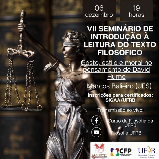 O VII Seminário de Introdução à Leitura do Texto Filosófico é mais uma realização do NUPEF em parceria com o componente de Introdução à Filosofia e seu Ensino. Neste Seminário o Prof. Doutor Marcio Balieiro da Universidade Fderal de Sergipe apresenará sua comunicação: !Gosto, Estilo e Moral no Pensamento de David Hume".