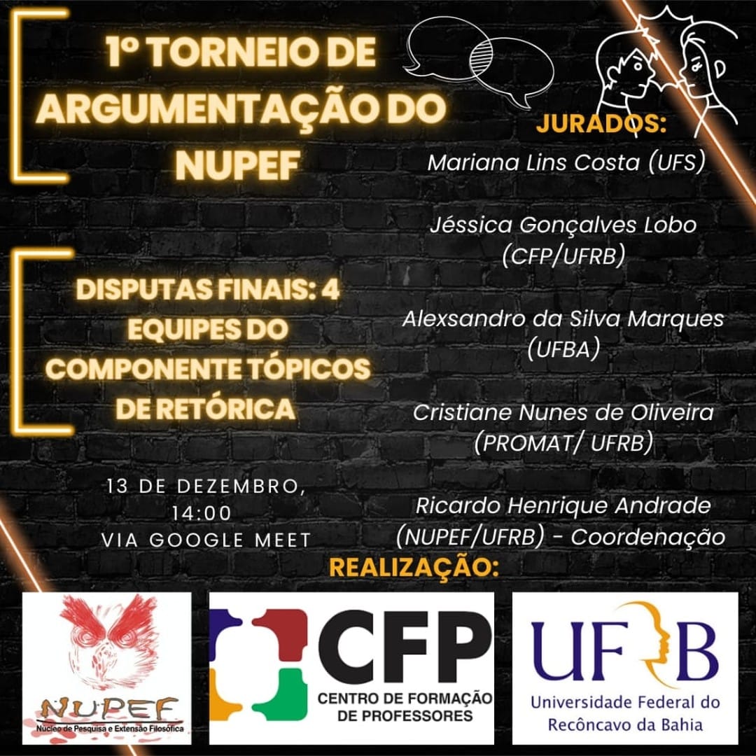 O NUPEF em parceria com o Componente curricular Tópicos de Retórica realizará o Primeiro Torneio de Retórica do NUPEF, com as partidas finais das equipes matriculadas.