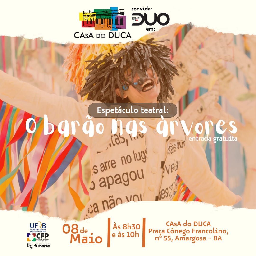 Espetáculo Teatral- O barão nas árvores, é o primeiro solo dirigido por Guilherme Hunder, vivido pelo ator, palhaço, circense, músico e produtor Marcos Lopes @marcoslopesba. Organizado pelo @coletivoduoteatro , será realizado na @casadoduca no dia 08/05 com duas sessões teatrais, sendo uma ás 8:30h e outra ás 10h da manhã.