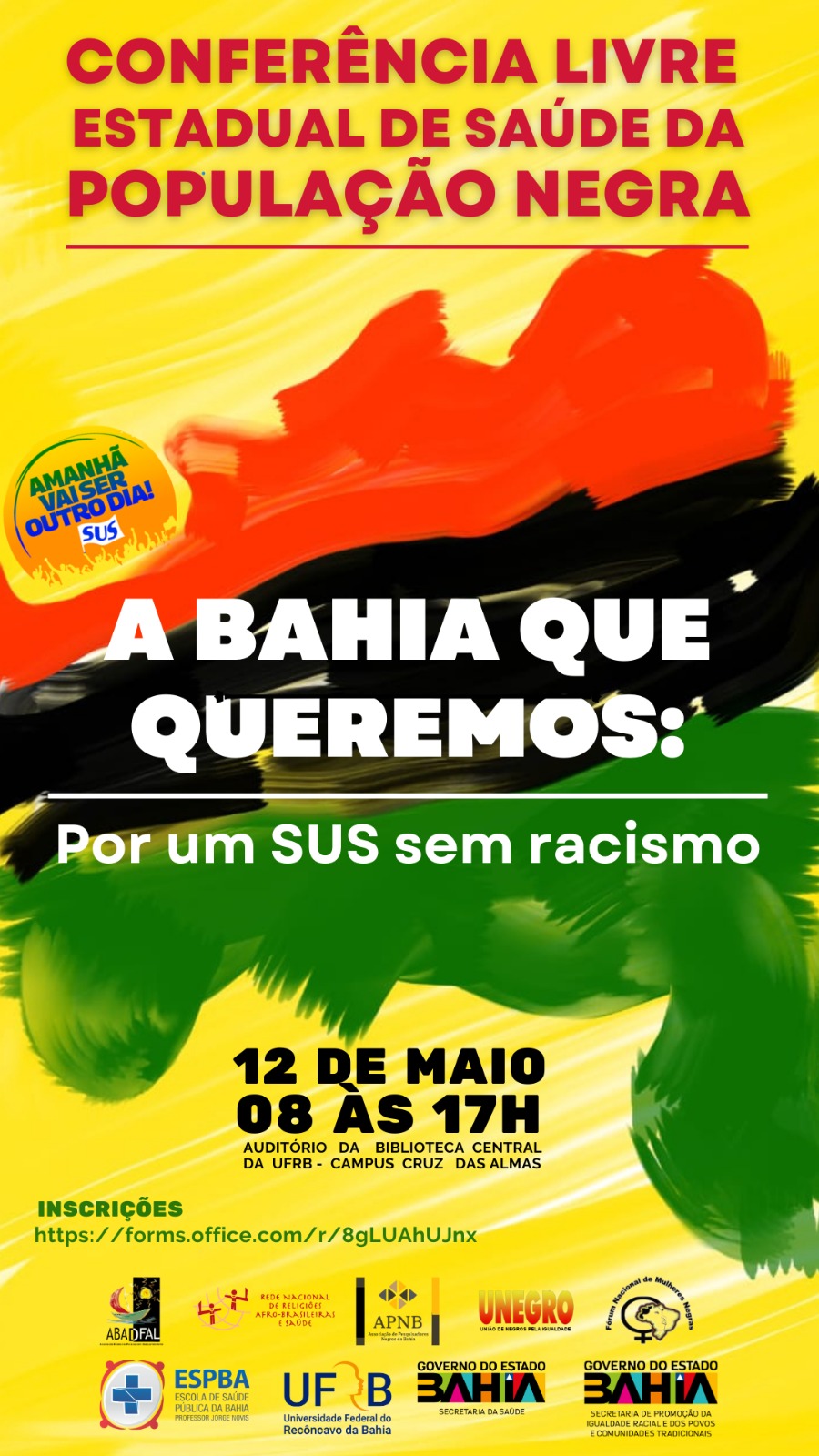 No dia 12 de maio de 2023, das 08h às 17h, na Biblioteca Central da Universidade Federal do Recôncavo da Bahia acontecerá a Conferência Livre Estadual de Saúde da População Negra. O evento tem caráter propositivo e deliberativo e visa reunir representações de diversos segmentos da sociedade para avaliar a situação da saúde e a qualidade da atenção à saúde da população negra, discutir a Bahia que queremos e o papel do controle social no combate ao racismo no SUS e na garantia do direito universal à saúde e propor estratégias para implementação da Política Estadual de Atenção Integral à Saúde da População Negra.