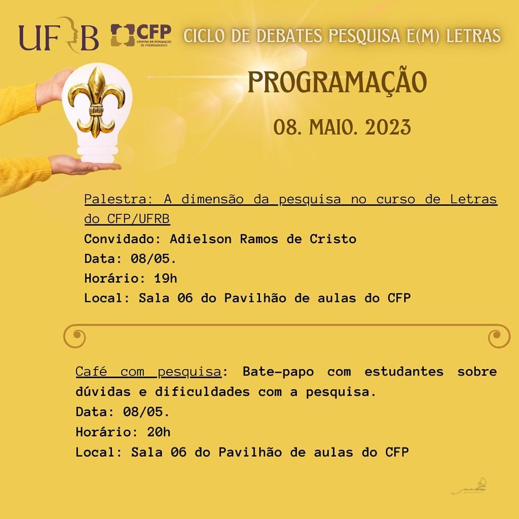 Colegiado e NDE do Curso de Licenciatura em Letras convidam os discentes para participarem da primeira edição do "Ciclo de debates - Pesquisa e(m) Letras". Teremos uma palestra seguida de um bate-papo com estudantes para exposição de dúvidas e dificuldades sobre a pesquisa e o TCC no curso de Letras