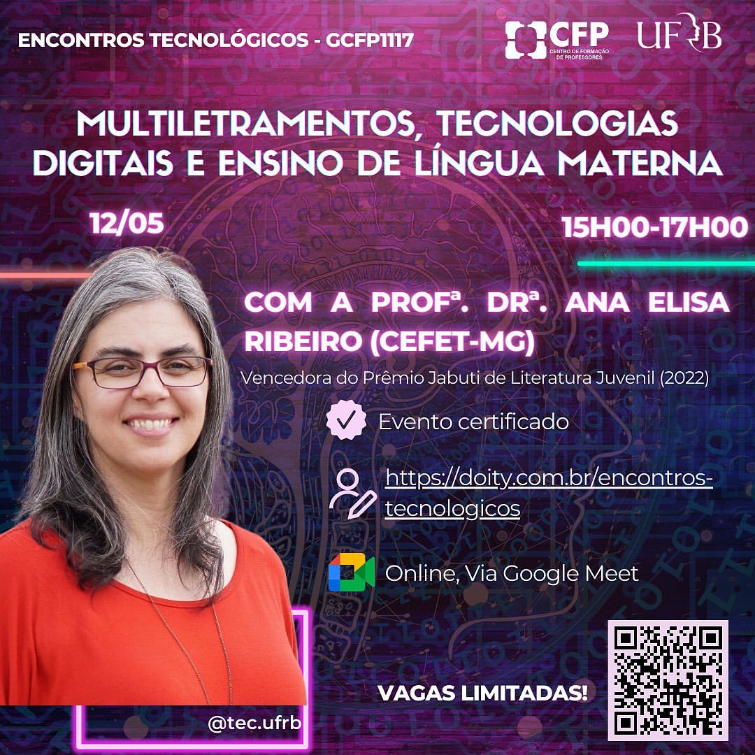 No último sábado, tivemos a nossa primeira edição dos Encontros Tecnológicos. E, olha, foi incrível! Reunimos nossos discentes de GCFP1117, a estudantes de outros semestres do nosso curso de Letras e participantes de diferentes áreas do Brasil. Havia gente do Amazonas ao Rio Grande do Sul! Foi muito importante e especial a oportunidade desse contato.Agora, temos muito mais! Na sexta, dia 12/05/2023, vamos bater um papo muito especial com a Prof.ª Dr. ª Ana Elisa Ribeiro @anadigital . A professora Ana dispensa apresentações, dada a sua expertise no universo dos letramentos digitais. Então, esta troca sobre “Multiletramentos, Tecnologias e Ensino de Língua Materna” há de ser imperdível! Teremos inscrições e certificados.Anote aí…Quando: 12/05, às 15h00Onde: via Google MeetInscrições: https://doity.com.br/encontros-tecnologicos-multiletramentosE aí, vamos ou bora?!#partiu !!!ERRATA: o link é o que está na descrição e não o do card! https://doity.com.br/encontros-tecnologicos-multiletramentos. Pedimos desculpas pelo lapso!
