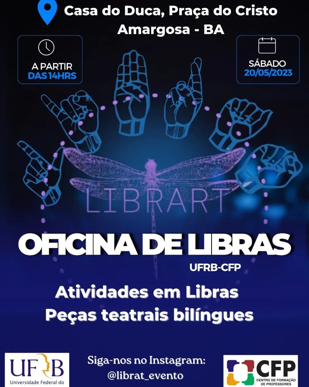 Convidamos toda comunidade para participar conosco da oficina de encerramento de nosso evento Libr'Art, será uma tarde muito produtiva e inesquecível, teremos Oficina de Libras e peças teatrais bilíngue. Contamos com sua presença!Acontecerá no próximo sábado, dia 20/05/2023, na Casa do Duca, Praca do Cristo, das 14h às 17h.