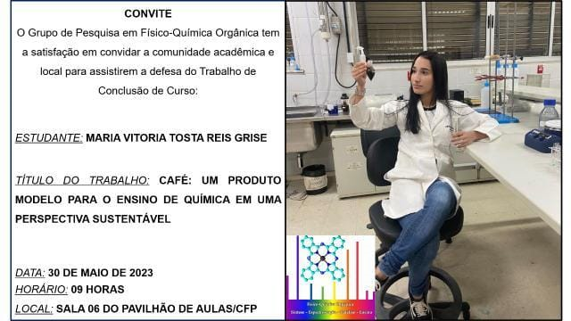 O Grupo de Pesquisa em Físico-Química Orgânica tem a satisfação em convidar a comunidade acadêmica e local para assistirem a defesa do trabalho de conclusão de curso da estudante Maria Vitoria Tosta Reis Grise
