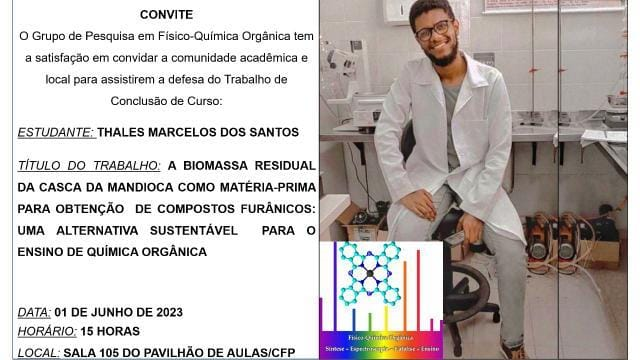 O Grupo de Pesquisa em Físico-Química Orgânica tem a satisfação em convidar a comunidade acadêmica e local para assistirem a defesa do trabalho de conclusão de curso do estudante Thales Marcelos dos Santos.