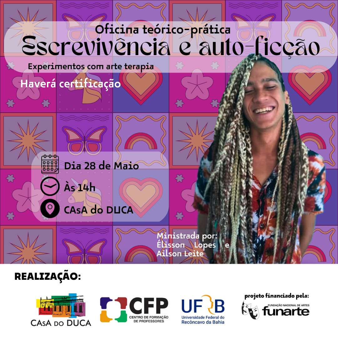 Ministrada pelo Diretor Ailson Leite e pelo ator Elisson Lopes, a oficina abordará a escrita criativa como forma de arte-terapia, praticando o relato de si com a intenção de praticar a introspecção (própria dos momentos de crise existenciais) e o distanciamento de si.