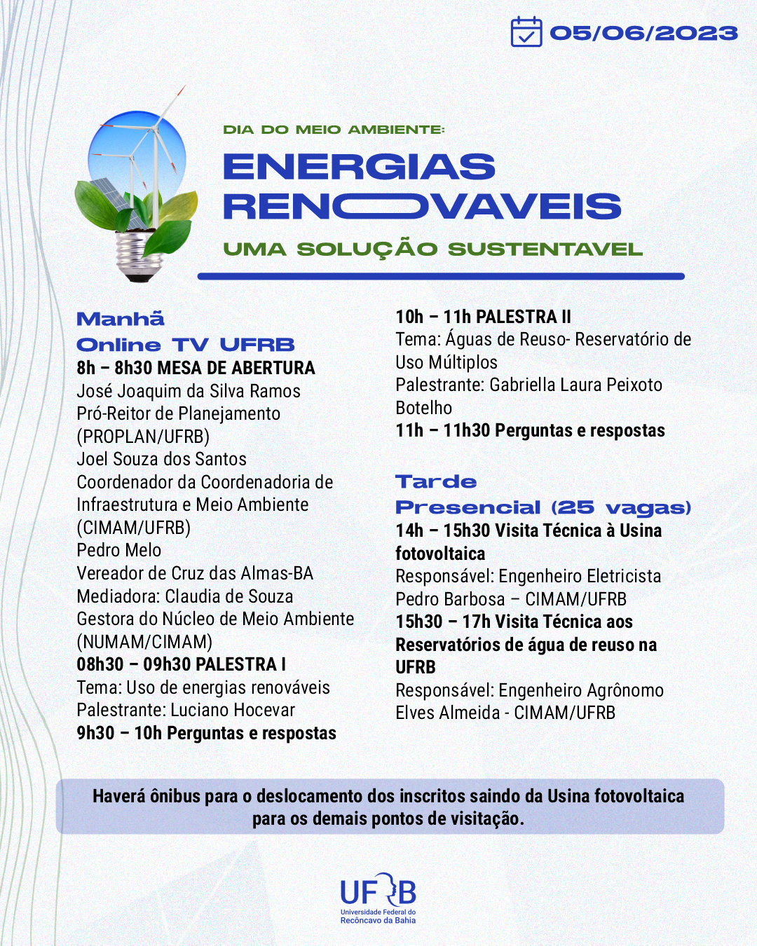 O Núcleo de Meio Ambiente, promoverá no dia 5 de junho, das 08h às 17h, o evento Dia do Meio Ambiente “ENERGIAS RENOVÁVEIS - UMA SOLUÇÃO SUSTENTÁVEL” em alusão ao Dia Mundial do Meio Ambiente. O evento será gratuito e ocorrerá de forma virtual no turno da manhã e, no turno da tarde, será presencial (25 vagas).
