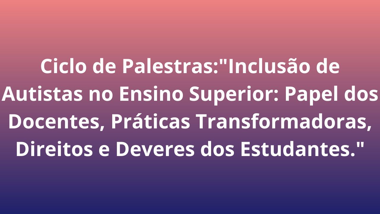 A inclusão dos alunos com Transtorno do Espectro Autista (TEA) é uma realidade na UFRB. Estes estudantes têm conseguido realizar o sonho de ingressar na graduação. Porém, eles possuem necessidades muito peculiares que exigem mudanças na conduta do docente e preparação da IES para realizar um acolhimento adequado para saber lidar com as características de comportamento destes estudantes.