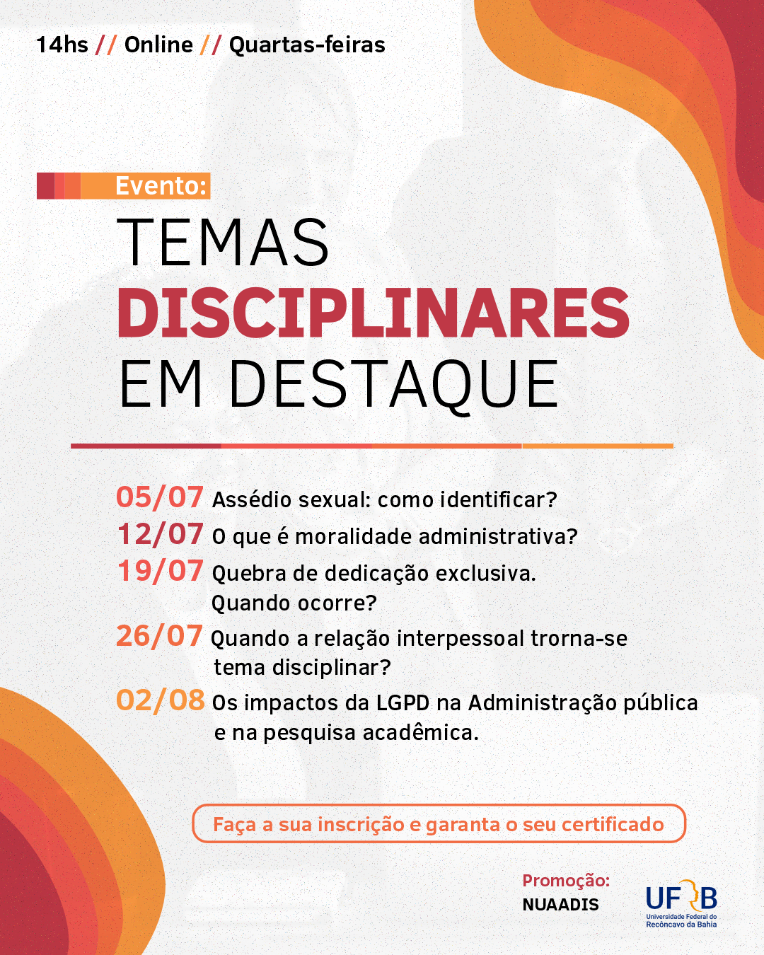 O que é moralidade administrativa? Como identificar assédio sexual? No que a Lei Geral de Proteção de Dados impacta ara a administração pública e para a pesquisa acadêmica? Esses são alguns temas que serão apresentados e debatidos no I ciclo de palestras organizado pelo NUAADIS/UFRB para a comunidade acadêmica.