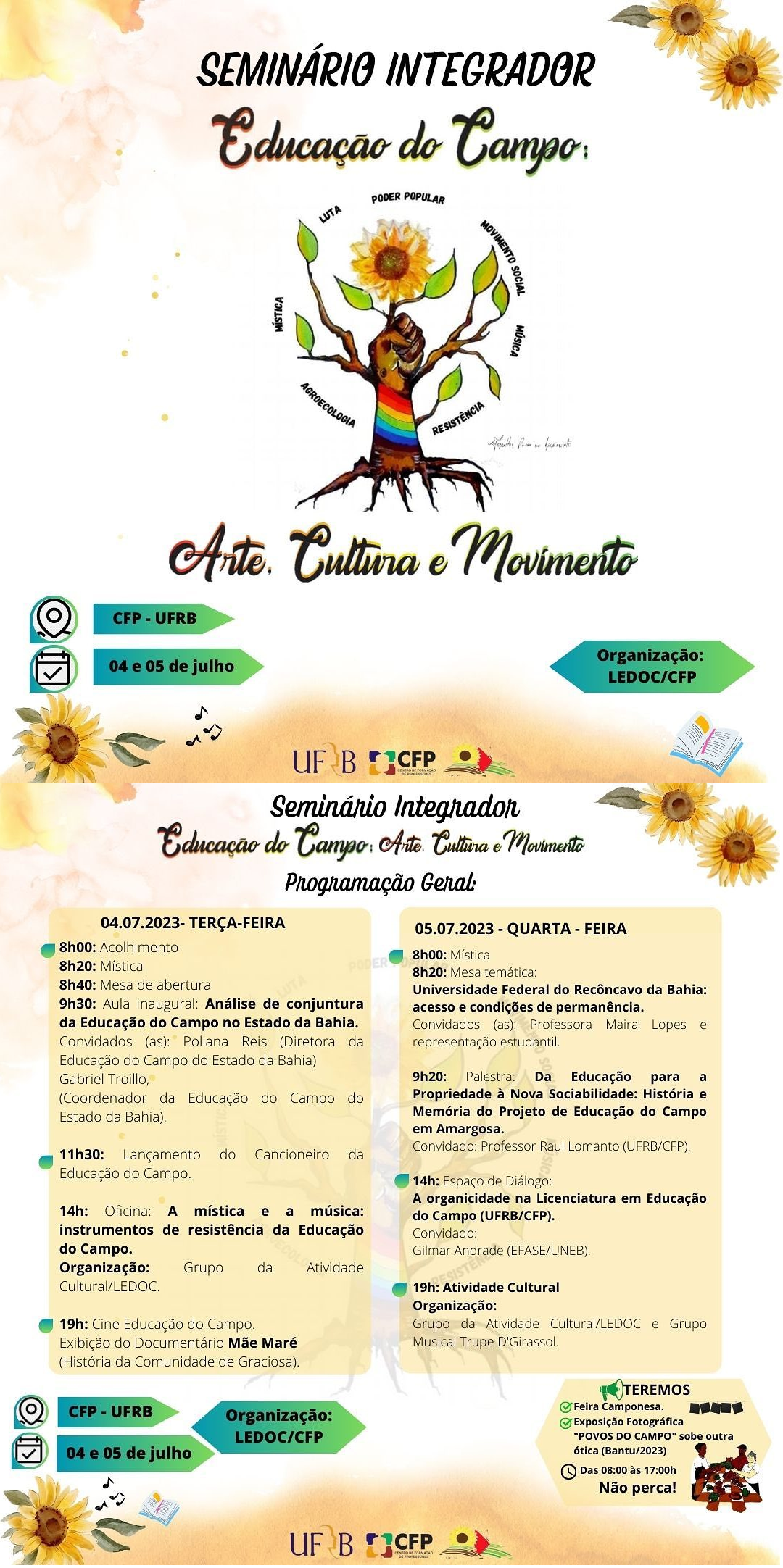 O evento Educação do Campo: arte, cultura e movimento, é uma iniciativa do Colegiado da Licenciatura em Educação do Campo no Centro de Formação de Professores da UFRB. A proposta está vinculada aos componentes do Seminário Integrador II, IV e V e tem como objetivo proporcionar aos discentes um momento de análise de conjuntura sobre a Educação do Campo, afirmando seus princípios e traçando um panorama histórico das lutas, desafios e conquistas. Além disso, neste evento pretende-se evidenciar a mística e a música enquanto elementos centrais no processo de formação de educadores do campo. A programação está distribuída nos dias 04 e 05 de julho de 2023, das 08:00h às 19:00h, de forma presencial no pavilhão de aulas do CFP UFRB.