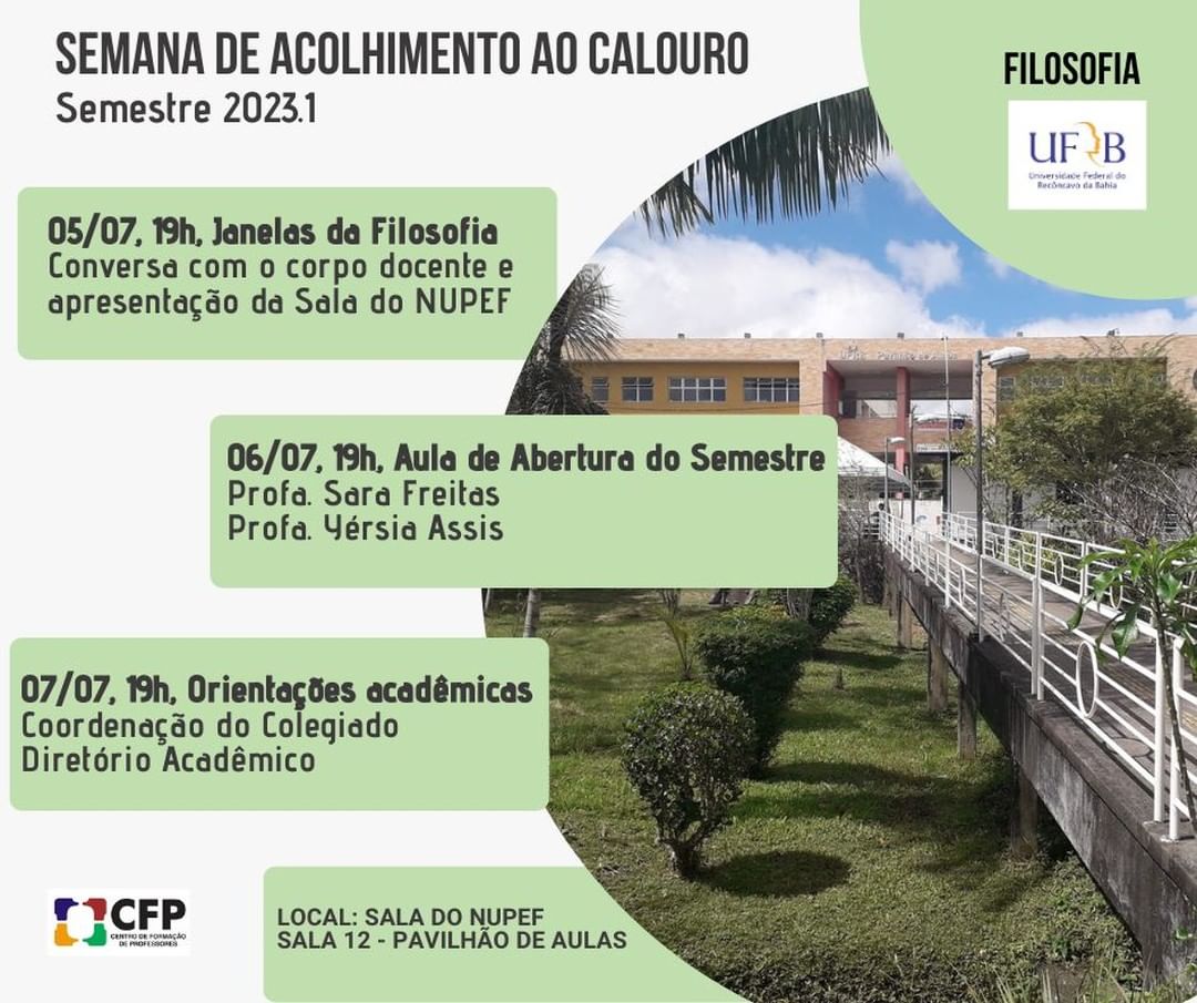 Semana de acolhimento ao calouro - Semestre 2023.1Local: Sala do Núcleo de Pesquisa e Extensão Filosófica (NUPEF) - Sala 12 do Pavilhão de Aulas do CFP05/07 - Janelas da Filosofia06/07 - Aula de Abertura do Semestre07/07 - Orientações acadêmicas