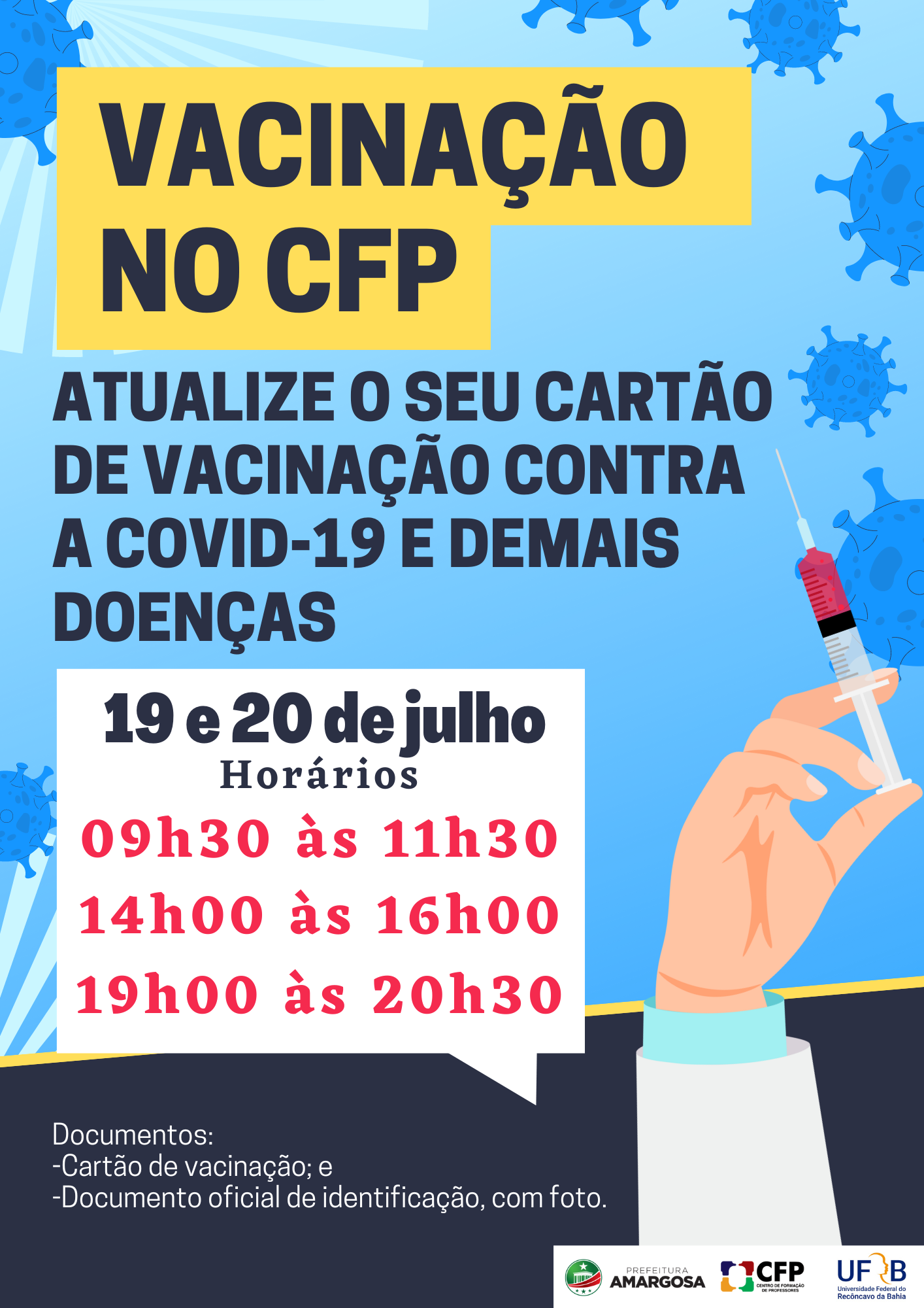 ?️ O Centro de Formação de Professores da UFRB, em parceria com a Prefeitura de Amargosa, promove vacinação para toda a comunidade acadêmica nos dias 19 e 20 de julho.✅Os(as) interessadas, devem comparecer ao Pavilhão de Aulas do CFP, munidos de carteira de vacinação e documento de identificação oficial (com foto) nos seguintes horários:? Período: 19 e 20 de julho? Manhã: Das 9h30 às 11h30? Tarde: Das 14h às 16h? Noite: Das 19h às 20h30.?? Se liga, a prevenção é o melhor remédio!*Esta ação faz parte da Semana Integra+CFP e do Projeto CFP Saúde.#ufrb_edu #cfp_edu #ᴠᴀᴄɪɴᴀsim