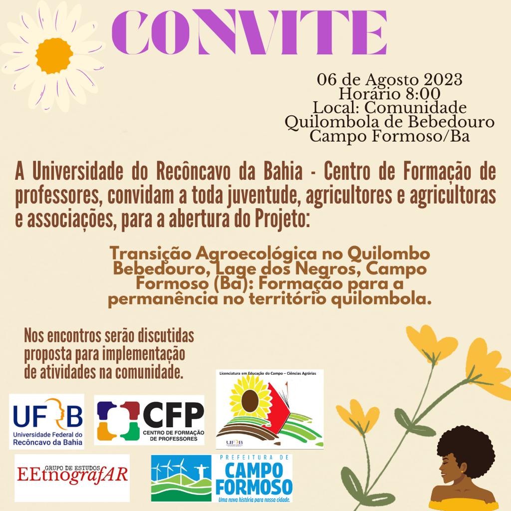O Projeto Transição Agroecológica no Quilombo Bebedouro, Lage dos Negros (Ba):formação para a permanência no território quilombola, coordenado pelo Prof. Tiago Rodrigues Santos(PPGEDUCAMPO/CFP/UFRB, GeografAR-UFBA, NUCAMPO-UFRB, LaPPa/CERES/UNICAMP) iniciará suas atividades, no dia 6 de agosto, na Comunidade Quilombola de Bebedouro, Território Quilombola de Lage dos Negros, município de Campo Formoso (BA). O projeto foi fruto de uma proposição conjunta do professor com a estudante do Curso de Licenciatura em Educação do Campo, Alaine Gama, moradora do quilombo.